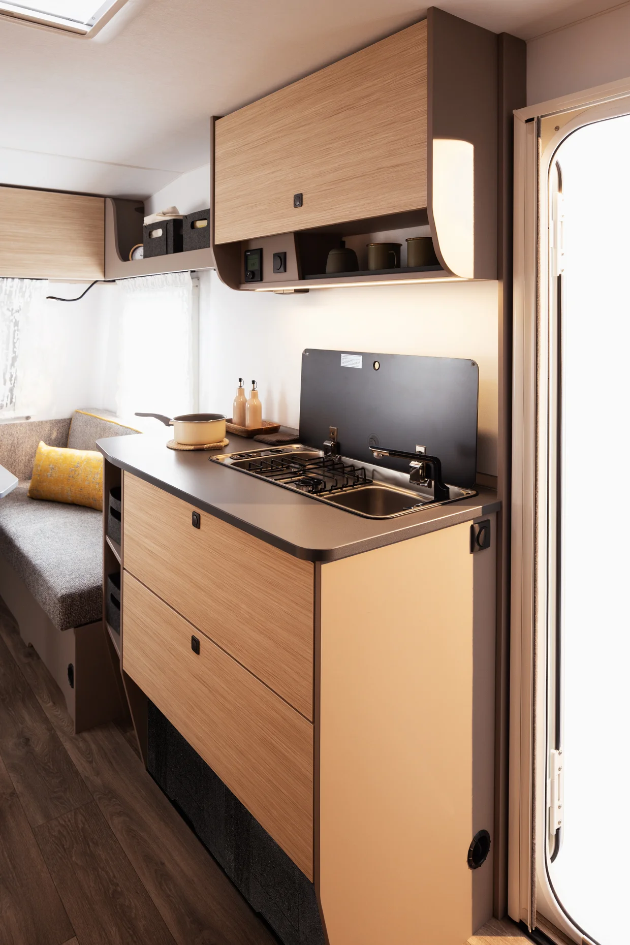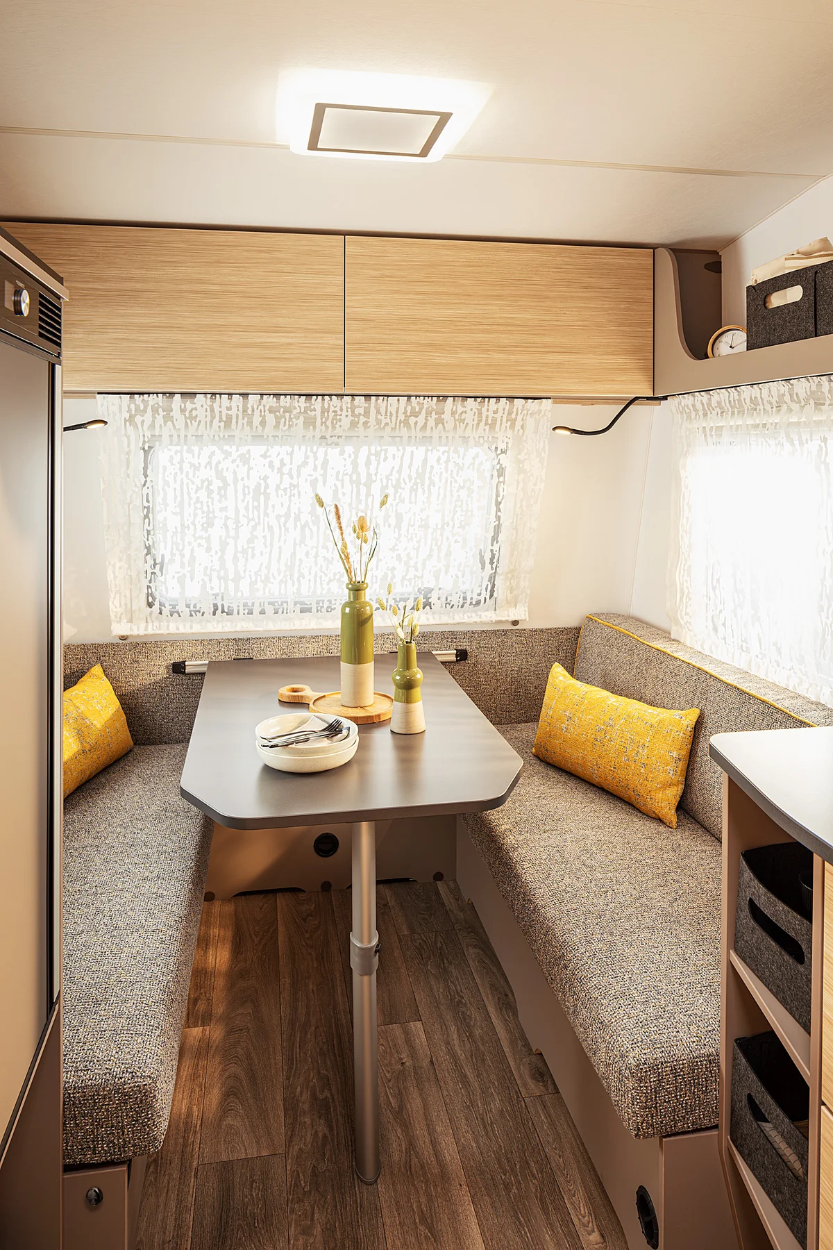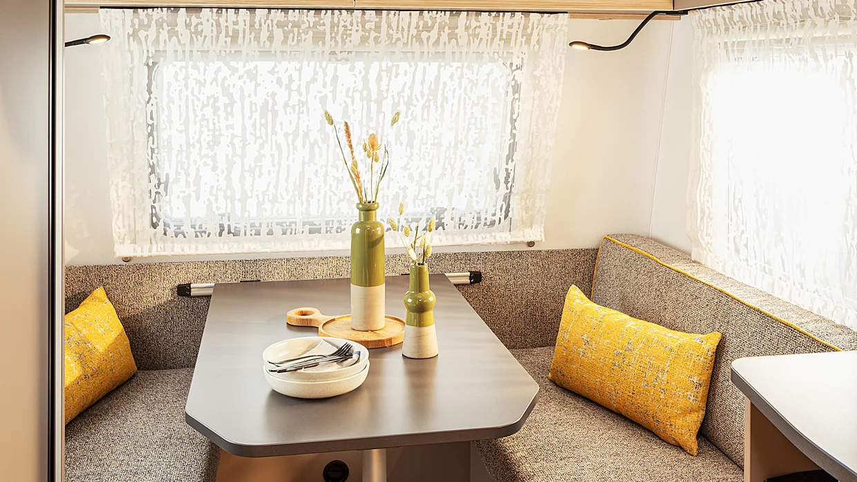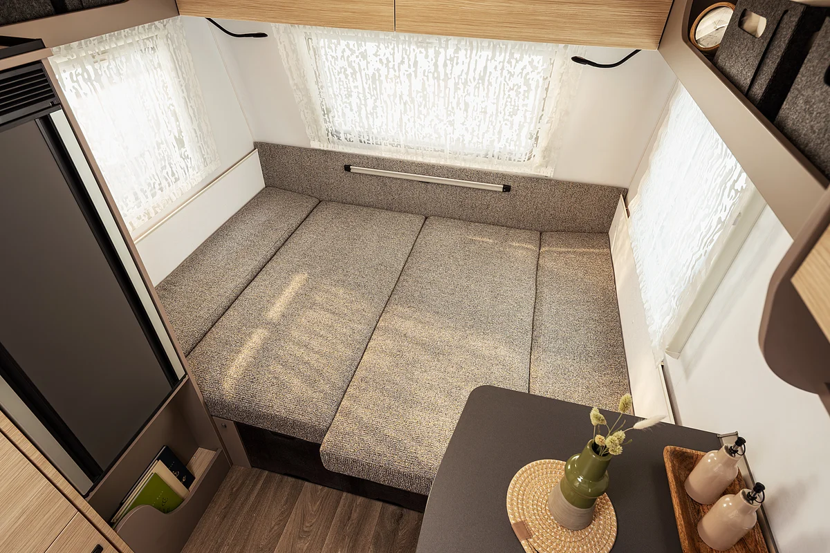 Dört tekerlek üzerindeki favori mekânınız: Oturma alanı keyifle vakit geçirmeye davet eder. Üç geniş pencere iç mekâna ışık ve doğayı taşır. Ortam yaratan LED aydınlatma sıcak bir atmosfer sağlarken, pratik stor perdeler mahremiyet sunar. Gece olduğunda ise oturma grubu birkaç basit adımda konforlu bir çift kişilik yatağa dönüşür.