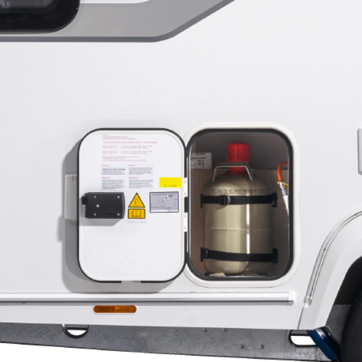 Karavanın dışarıdan rahatça yüklenebilmesi için sol ön tarafta 999 x 419 mm boyutlarında harici depolama kapağı